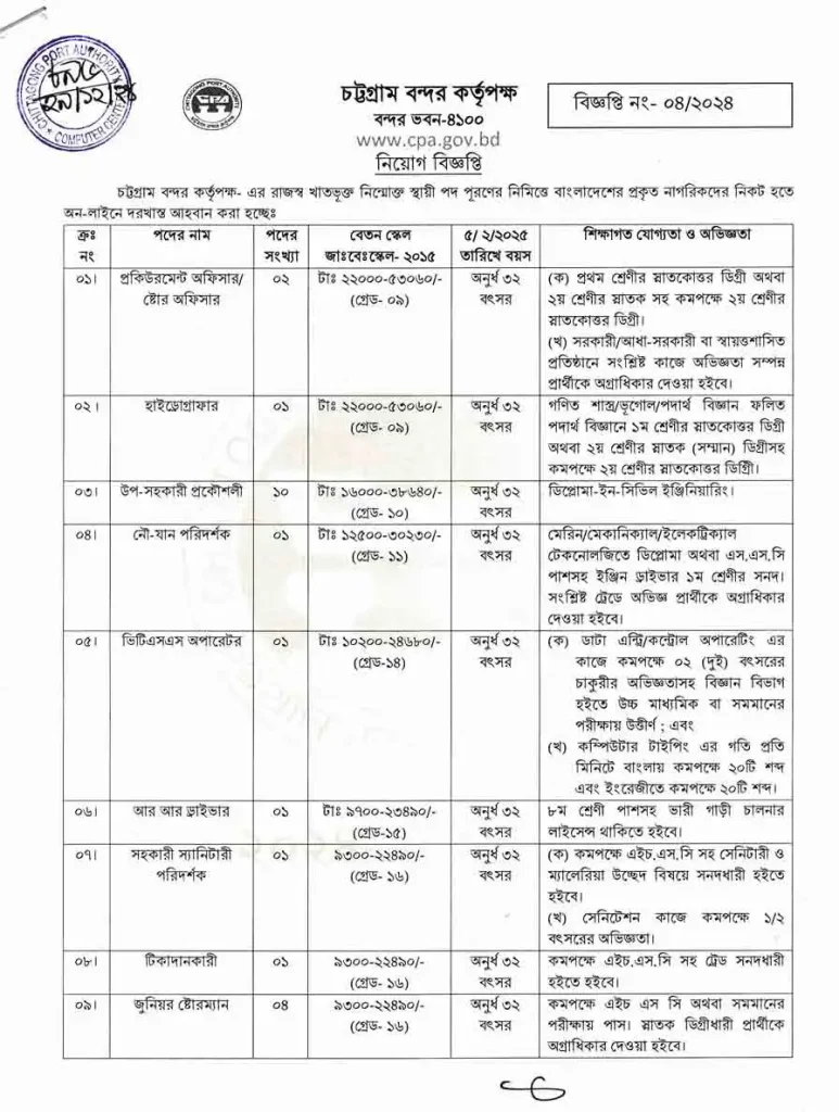 The Chittagong Port Authority (CPA) has announced multiple job vacancies for 2025. Below are the details of the available positions and application guidelines: