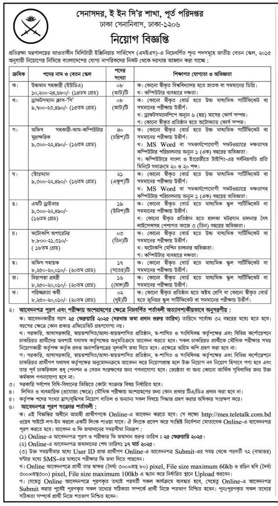 মিলিটারি ইঞ্জিনিয়ার সার্ভিসেস (MES) নিয়োগ বিজ্ঞপ্তি ২০২৫